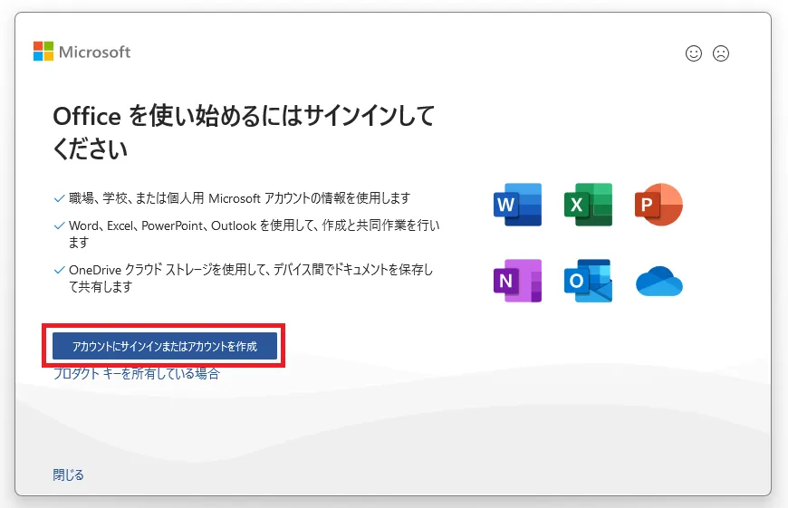 - If a dialog saying “Sign in to get the most out of Office” or similar is displayed: You are not signed in to any Microsoft account in the Office app. Click “Sign in or create account”.