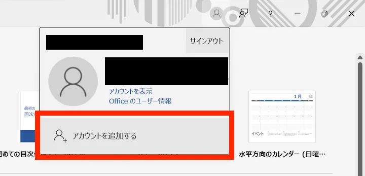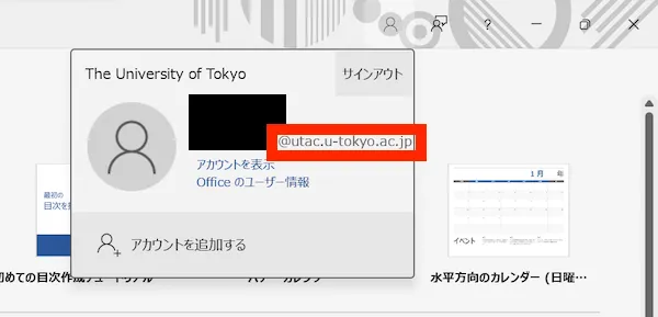 - If the above screen does not appear and the normal editing screen is displayed: You are signed in to the Office app with some Microsoft account. Click the person icon in the upper right corner, then check which account you are currently signed in with. If you are signed in with an account other than your UTokyo Account, select “Add account”.