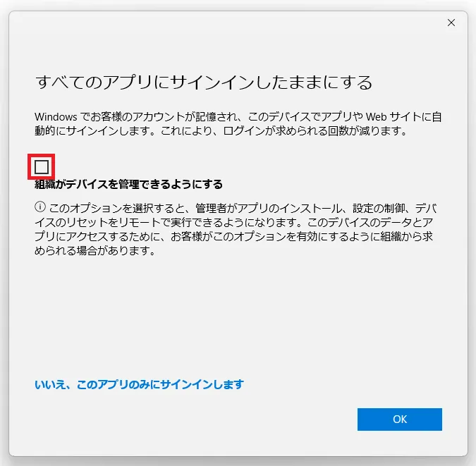 On Windows, a dialog saying “Stay signed in to all your apps” may appear. Depending on your selections here, error messages may occur while using the Office app. To prevent this, please respond as follows: