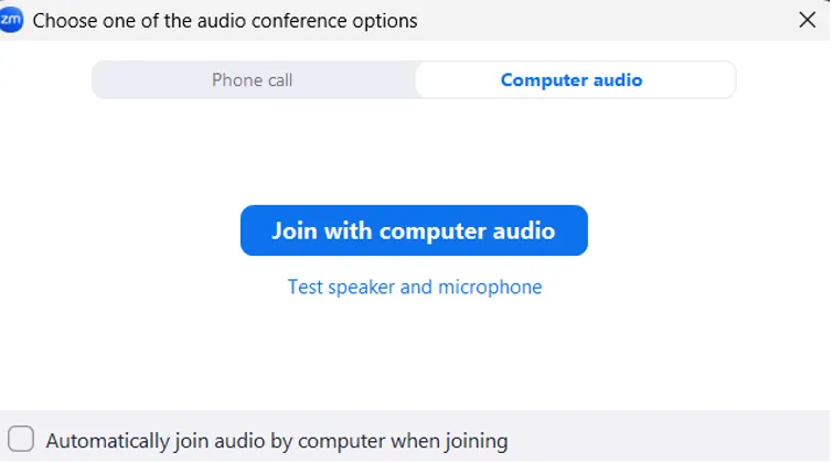 - When you join, automatically connect to audio on your computer:by checking the box, you can save yourself the trouble of confirming the dialog for the audio selection as shown in the image below when you enter a meeting.