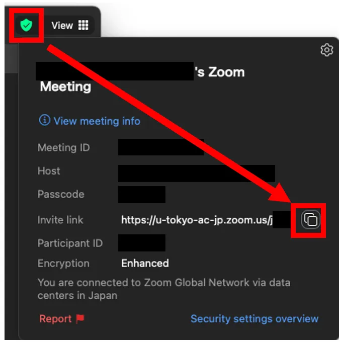 - When the meeting starts, notify the participants by pressing “^” next to “Participants” on the meeting screen and “Copy invite link” or by “Copy Link” from the green shield symbol at the top of the meeting screen and sending the link to the participants.