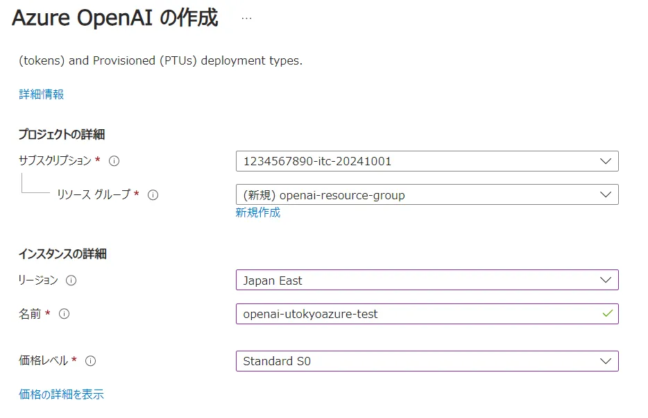 • 名前:リソースの Azure ポータルでの名称を設定します.ここではopenai-utokyoazure-testとしています.