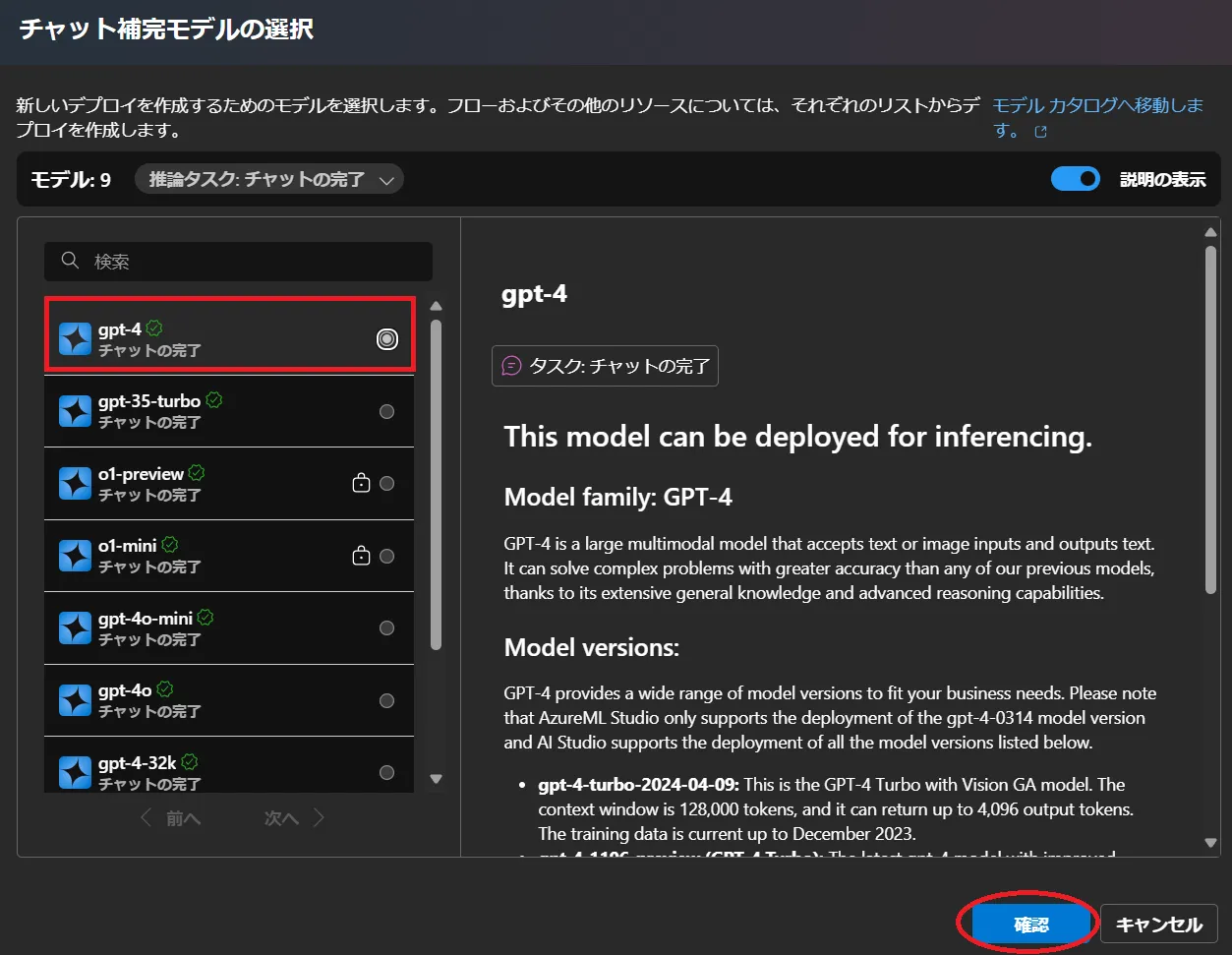 • モデル選択画面になりますので,左側のリストからgpt-4を選択し,右下にある確認をクリックしてください.