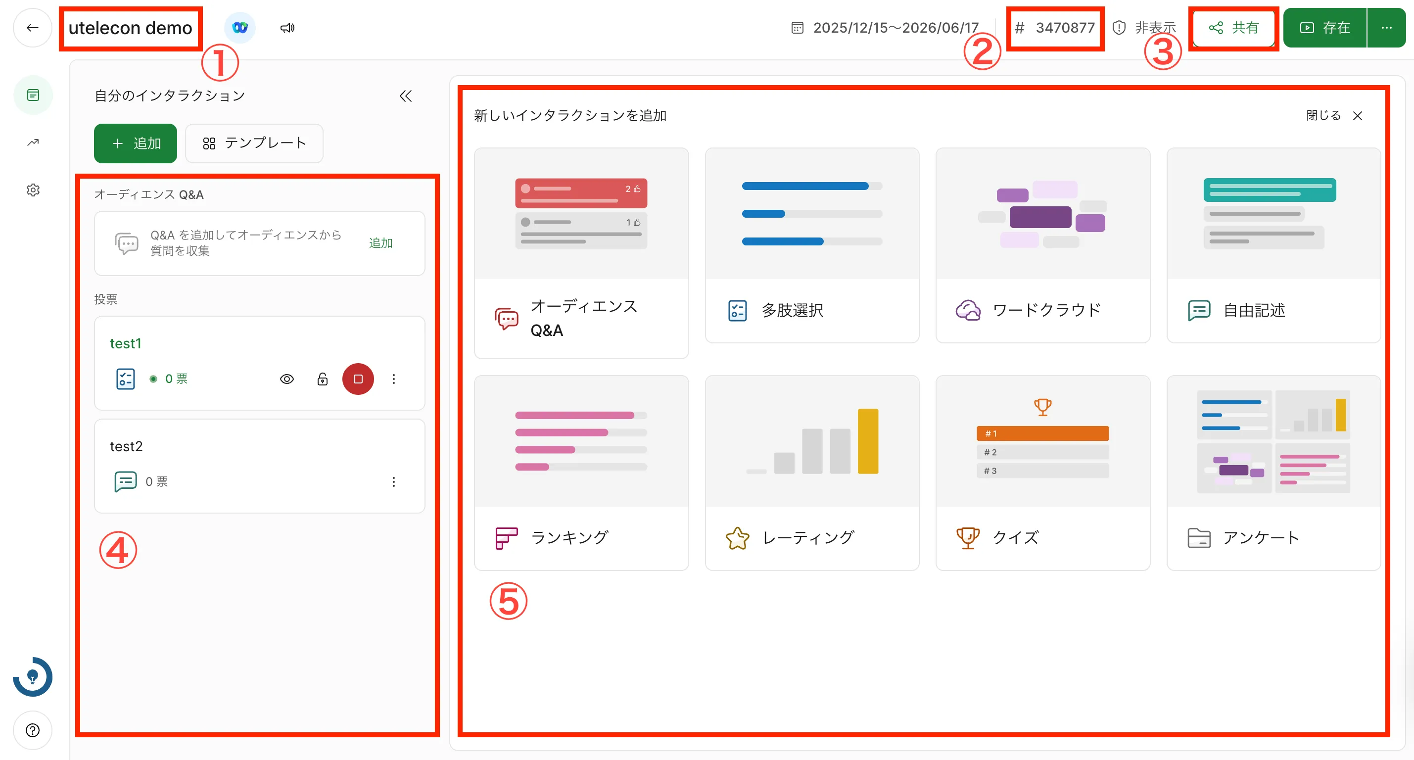 投票を作成するには,画面左上の「+ 追加(新しいインタラクションを追加)」を選択してください.