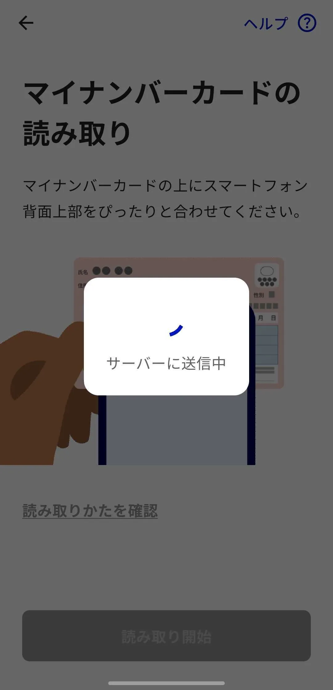 - 「カードを読み取っています…」と表示されている間は,マイナンバーカードをスマートフォンから離さないでください.