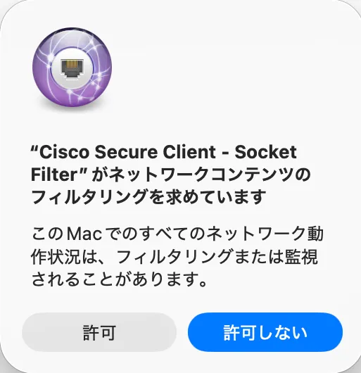 手順D: しばらく待つと,以下のような「必要なアクション Cisco Secure Client - システム」というポップアップが表示されることがあります.その際は表示される手順にしたがって,「システム設定」→「一般」→「ログイン項目と機能拡張」にすすみ,「機能拡張」の「カテゴリ別」を選択し,「ネットワーク機能拡張」の右にある「🛈️」ボタンをクリックし,表示された項目のうち「Cisco Secure Client - Socket Filter」を有効にしてください.この際,以下のような「“Cisco Secure Client - Socket Filter”がネットワークコンテンツのフィルタリングを求めています」というポップアップが表示されたら,「許可」をクリックしてください.