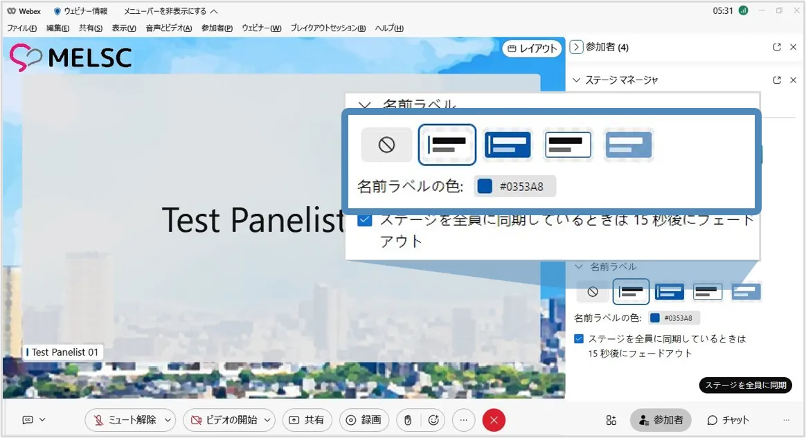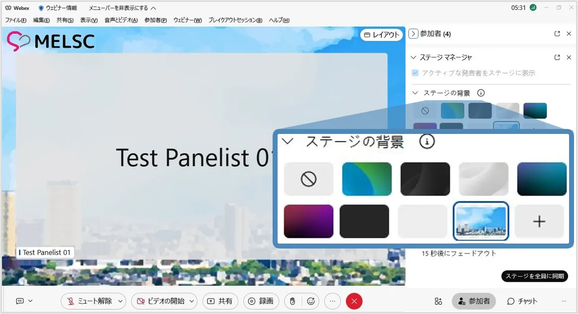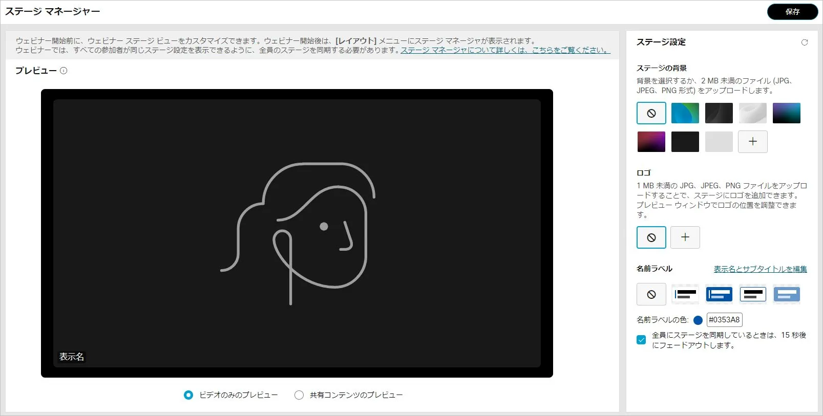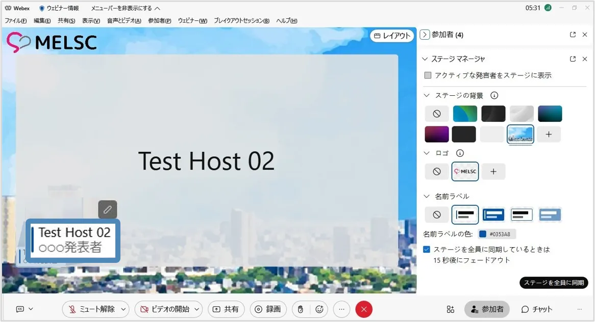 • ステージマネージャー機能を使用すると,背景やロゴ・カスタマイズした名前ラベルをステージに設定でき,効果的なウェビナーの開催に貢献します.