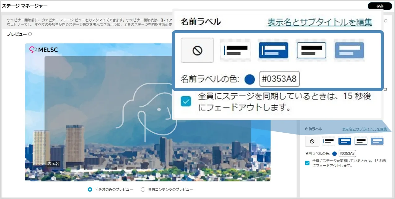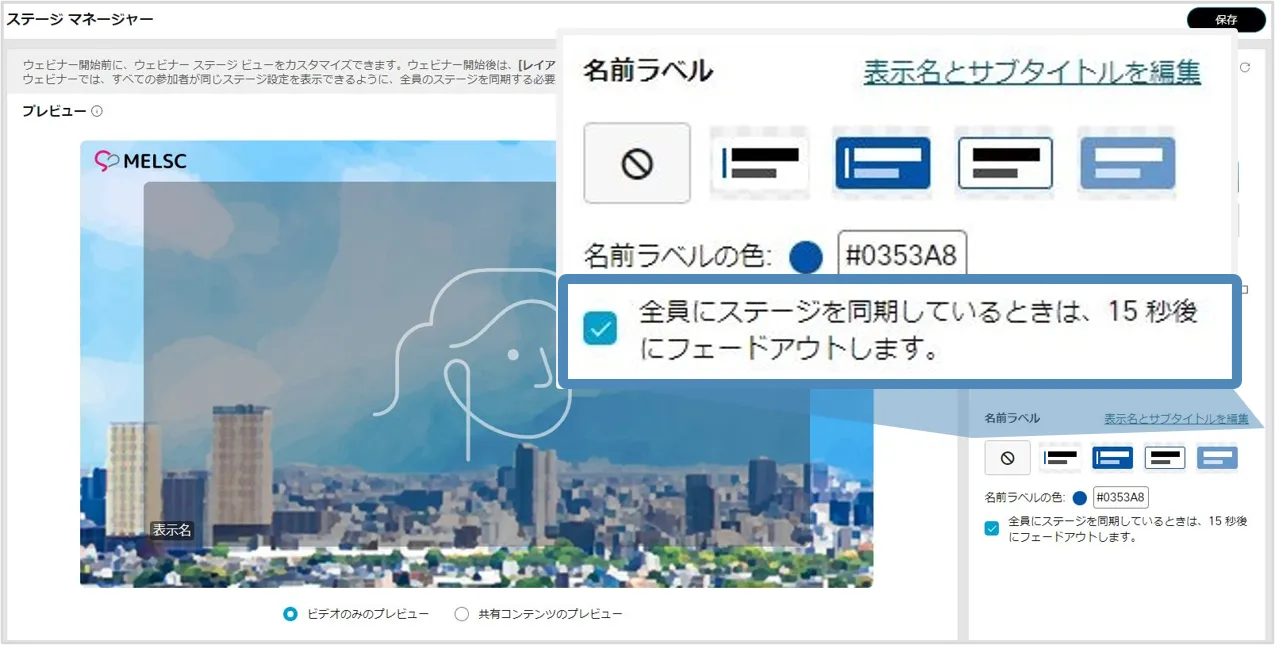 • 「全員にステージを同期しているときは,15秒後にフェードアウトします」を有効にすると,15秒後に名前ラベルは表示されなくなります.無効の場合,名前ラベルは表示しつづけます.
