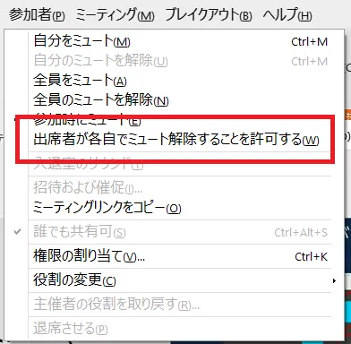 • 会議が開始されてからも,「参加者」メニューに「参加時にミュート」という機能があります.