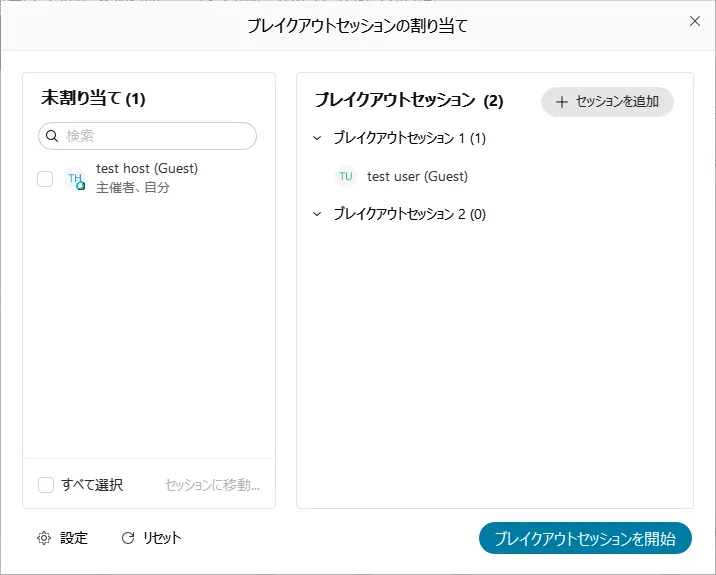 • 「割り当て」をクリックすると,ブレイクアウトセッションの管理ウィンドウが表示されます.