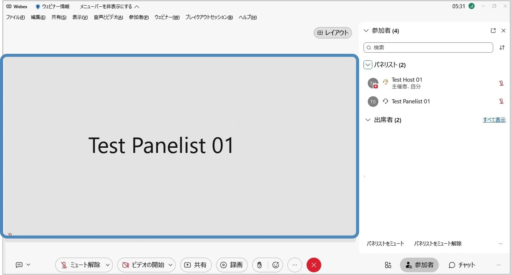 • スケジュール後:ウェビナー情報 > 練習セッションの出席者ビュー練習セッションで利用する映像や音声を設定