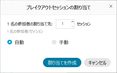 • 「ブレイクアウトセッション」ボタンを押すと,ブレイクアウトセッションの割り当てウィンドウが表示されます.
