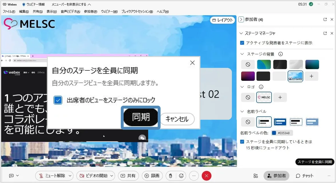 5. 「同期」を選択し,ステージのレイアウトを出席者に同期します.