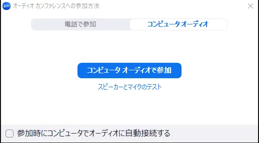• 参加時にコンピュータでオーディオに自動接続する:チェックを入れると,下の画像のようなオーディオの選択に関するダイアログを確認するという入室時のひと手間を省くことができます.